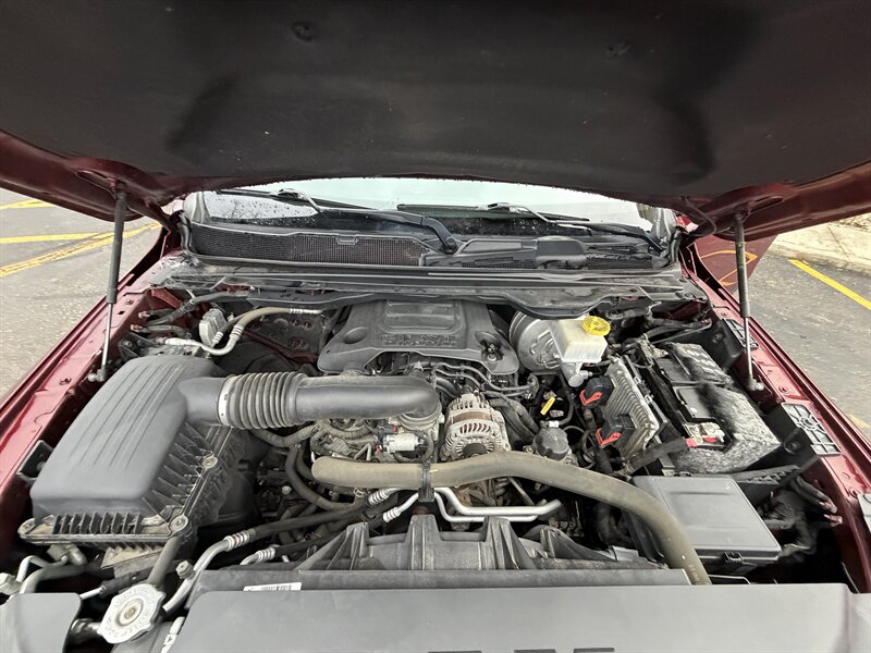 Meet the 2020 RAM 1500 Big Horn — the red-striped rhinoceros of pickup trucks. Dressed in Delmonico Red Pearl Coat with a Diesel Gray/Black interior, this one pairs classic muscle with everyday practicality: a HEMI 5.7L V8 producing a hearty 395 hp and 410 lb-ft of torque, mated to the silky 8-speed automatic 8HP75 and a 3.21 axle ratio. In plain terms: it’s loud when you want it to be, civilized when you don’t, and always ready to work.