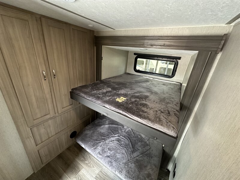 The first bedroom is home to bunk beds and cabinet space. The slide opens up floor space to move around in the bedroom.